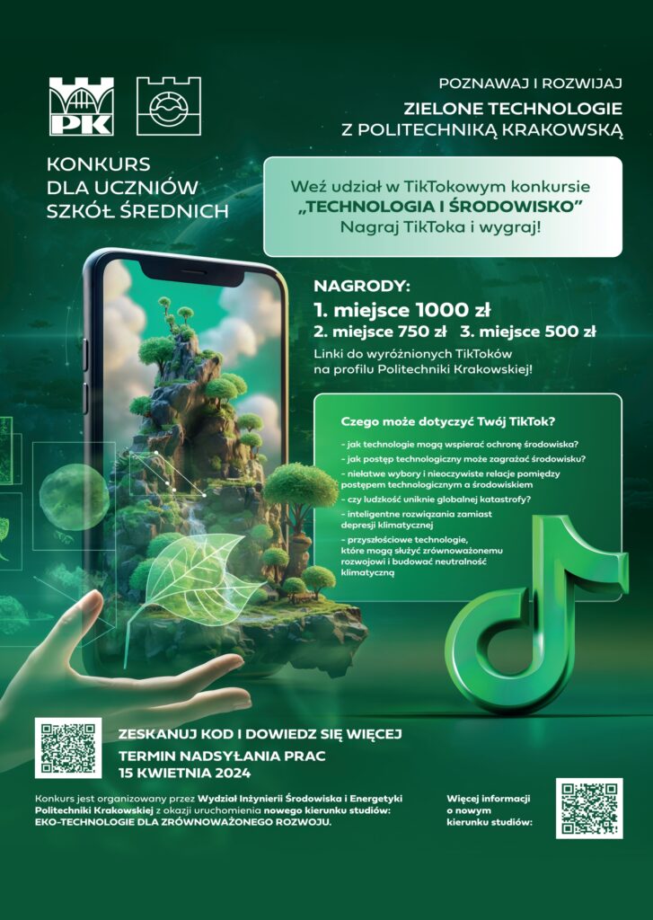 Z okazji uruchomienia nowego kierunku studiów I stopnia EKOTECHNOLOGIE DLA ZRÓWNOWAŻONEGO ROZWOJU Wydział Inżynierii Środowiska i Energetyki PK zaprasza uczniów szkół średnich do udziału w TikTokowym konkursie pt. „TECHNOLOGIA I ŚRODOWISKO”. Żeby wziąć udział, należy nagrać TikToka pokazującego – w sposób ciekawy, inspirujący i nieoczywisty – jak nowe techniki oraz technologie zmieniają otaczające nas środowisko i jak służą ochronie środowiska oraz jak postęp technologiczny zagraża środowisku. Niełatwe wybory i nieoczywiste relacje pomiędzy postępem technologicznym a środowiskiem. Przyszłościowe technologie, które mogą służyć zrównoważonemu rozwojowi i budować neutralność klimatyczną. Jak radzić sobie z negatywnymi skutkami postępu technologicznego…